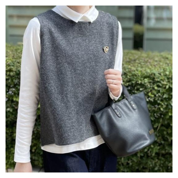 ウール混の縮絨素材を使用しており、気軽にシャツやブラウス、カットソーと重ね着をしていただけます。
