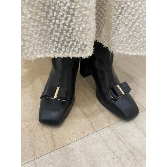上品なリボンとスクエアトゥで甘さを抑えた大人のショートブーツです。