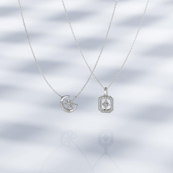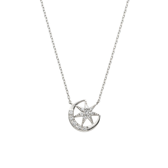 プラチナの三日月にスターモチーフを閉じ込めた、ロマンティックなムード溢れるネックレス。