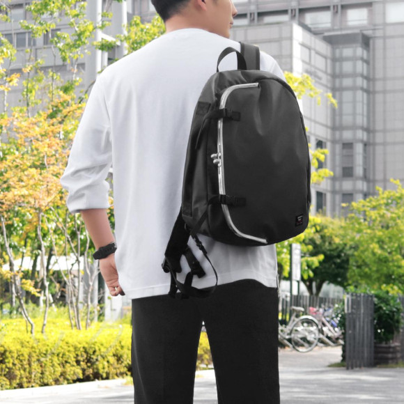 ポリエステル生地に特殊な加工を施し、高い撥水性を実現。少し濡れてもサッと拭けるので、日常でも気兼ねなく使えます。光沢感を抑えたマットな質感でビジネスにもカジュアルにも持ちやすいベーシックな2色展開。