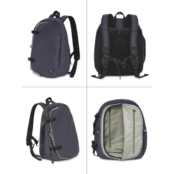 メイン収納は正面と背面側に仕切りがあり、背面側はクッション性のある生地になっているのでPCやタブレットなど電子機器を入れても安心です。外側正面のがま口にはスマホやキーケースなどの小物の収納に便利な内ポケット付き。