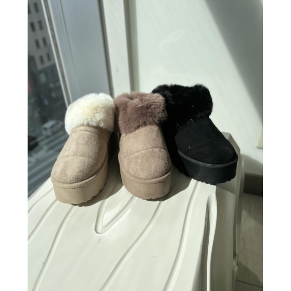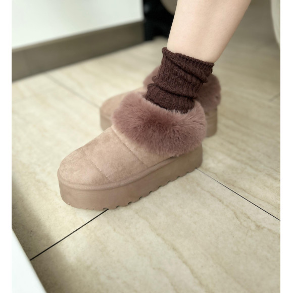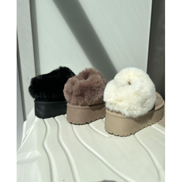 履き口にふわっふわのフェイクファーをたっぷりとあしらったムートン風スリッポン。
