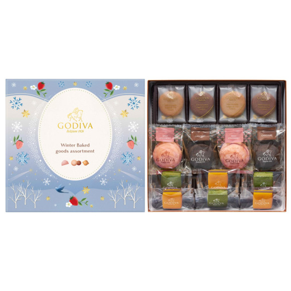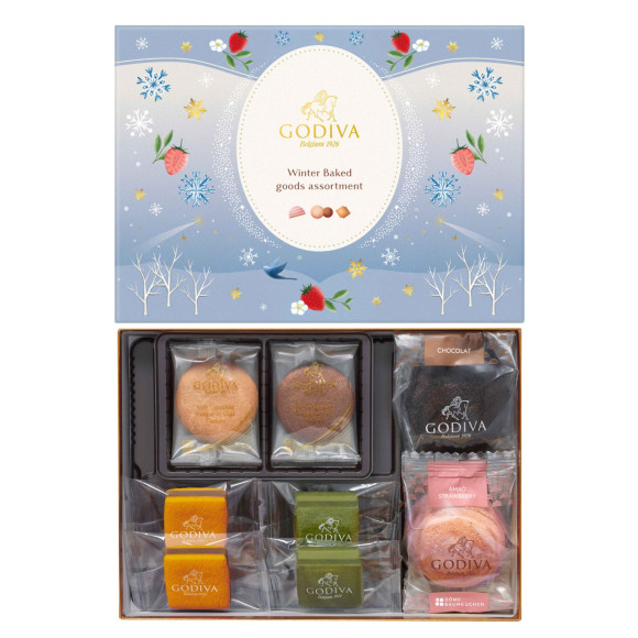 冬の贈り物にぴったりの、苺や雪の結晶が舞ったキュートなデザインのパッケージにゴディバで人気の焼き菓子