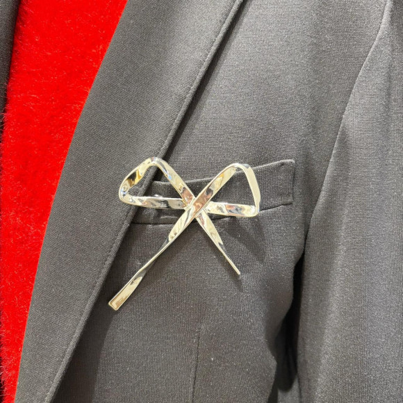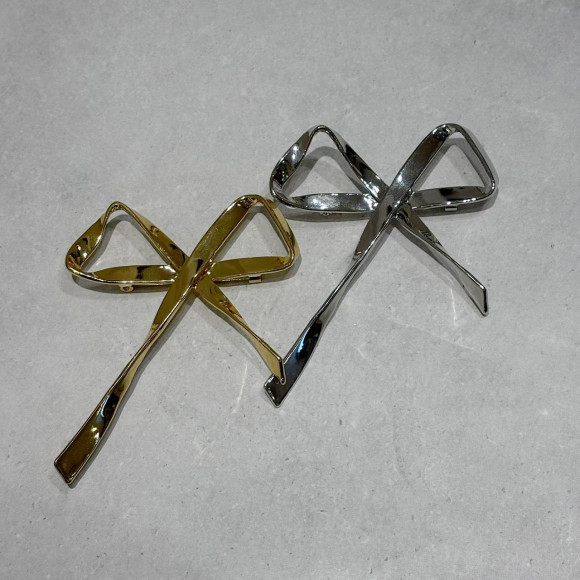 立体感のあるリボンデザインが目を引くメタルブローチ。ゴールドとシルバーの輝きがコーデに洗練されたアクセントをプラスします。