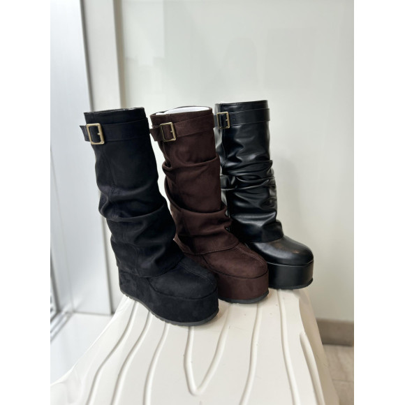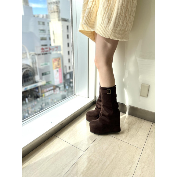 ボリューム感のあるウェッジソールのブーツとベルト付きのカバーがセットになったシューズ。 クシュクシュッとしたたっぷりとしたカバーで 足元にボリューム感をプラスすることで、腿周りをすっきりと魅せてくれる美脚アイテム。 カバーは取り外し可能なので、2way使用可能なのでコーディネートの幅が広がります!