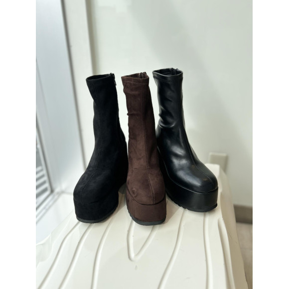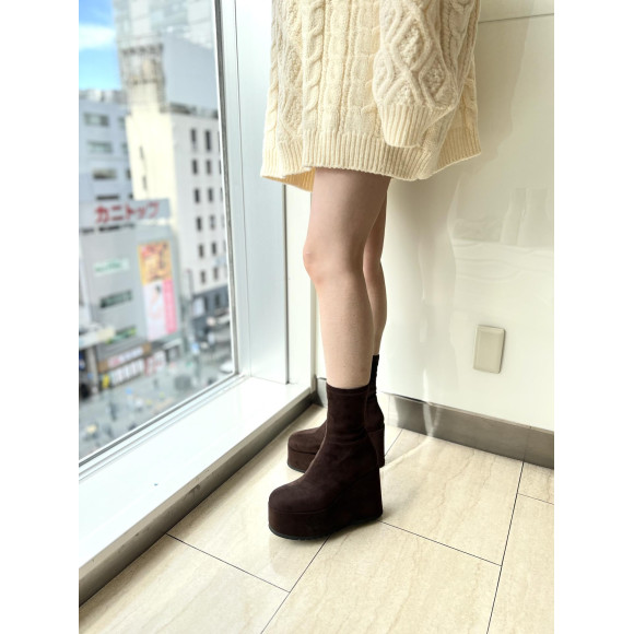 取り外した状態のブーツはシンプルなウェッジソールで、足首をストレッチ素材でキュッと絞り すっきりとしたシルエットでちょっぴり大人な印象に。