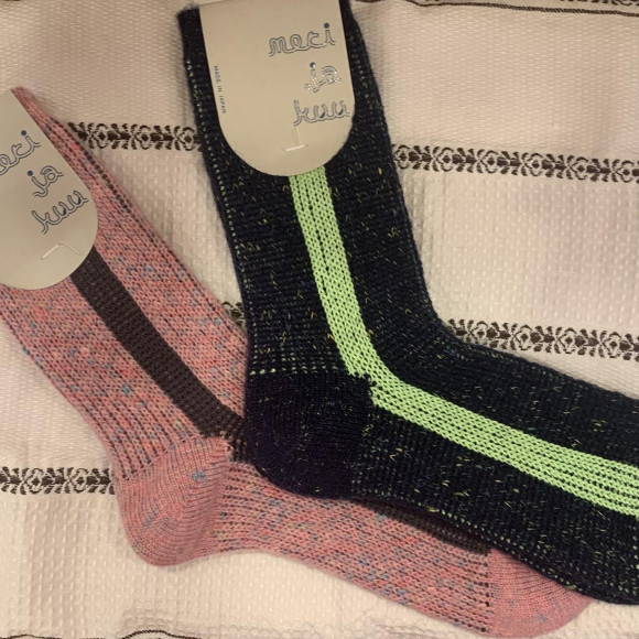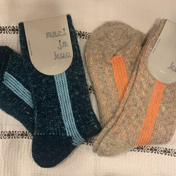 ふんわりとしたタムヤーンをベースに、センターにラインを入れてざっくりと編んだ靴下です。