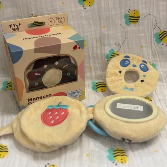 まんまるドーナッツを開くと、いないいないばあ!ミラーを見ながらお顔のまねっこをして、思わずにっこり笑顔になれる布おもちゃです。