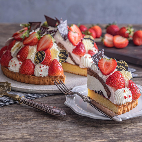 しっとりとしたケークタルトにミルククリーム、いちごクリームを重ね、ラズベリージャムとチョコクランチをしのばせました。甘酸っぱいあまおうと雪の結晶のチョコを可愛らしく飾りました。