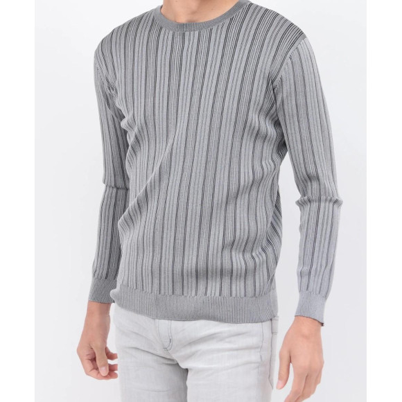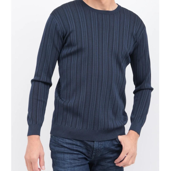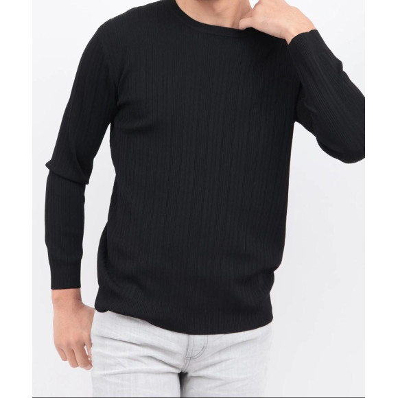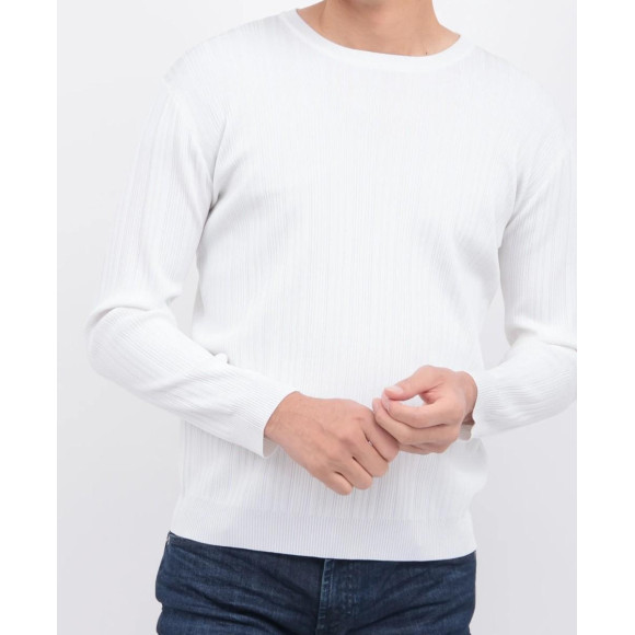 艶ありの滑らか生地のクルーネックニットは合わせを選ばずオールマイティーに大活躍な一枚。