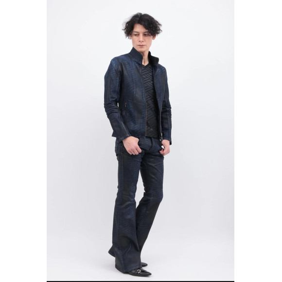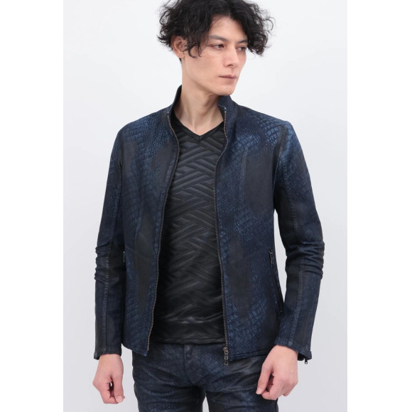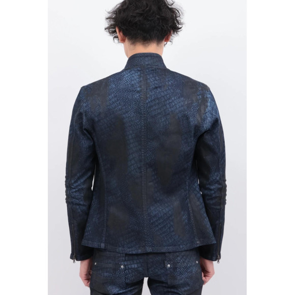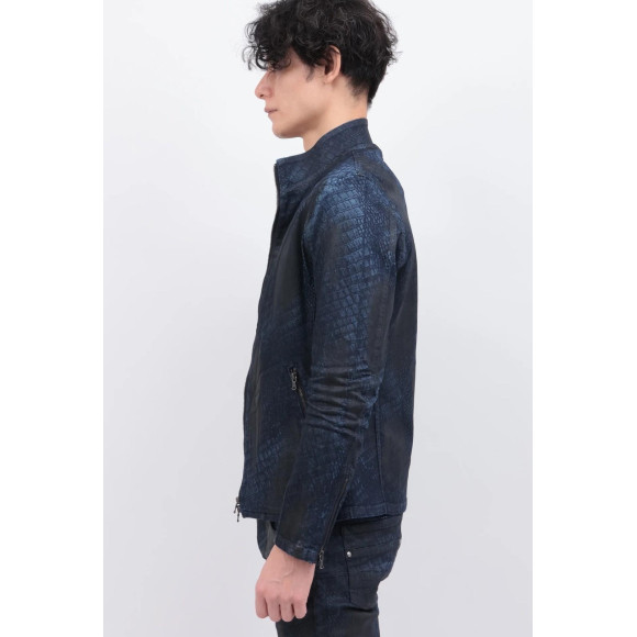 全面にクロコダイル柄レーザーを照射し、ムラ状にブラックコーティングを吹き付け手塗りを施したオールメイドインジャパンの一着です。