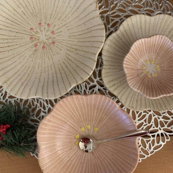 お花に見立てたデザインにお菓子のように優しい風合いの釉薬をかけた器シリーズが入荷しました!