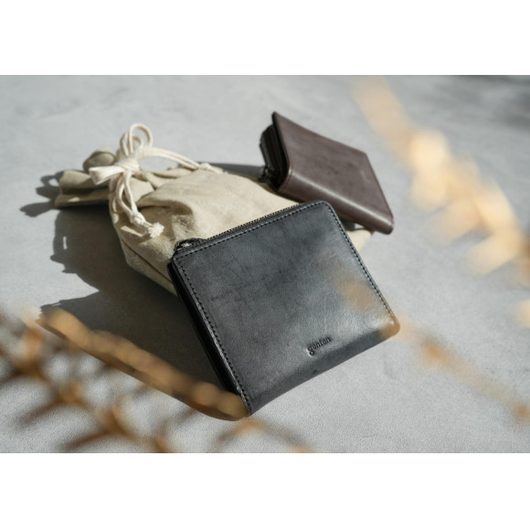 ハリと軽やかさのある革は、使い始めは白いワックスが表面を包み込み、時間の経過とともに透明感のある艶へと静かに変化していきます。使い続けるうちに革になじみ、ワックスが均一に浸透していくことで、より奥行きある艶と透明感が生まれます。