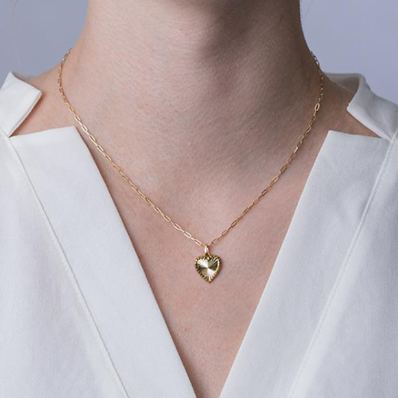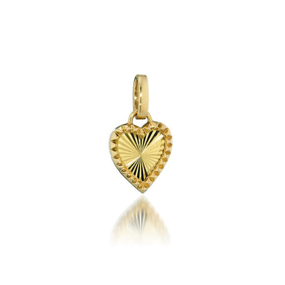 時計の文字盤などで使用されている“ギョーシェ彫り”の技法で、ハートプレートを回転させながらダイヤモンドの刃を用いて放射状に1ラインずつ丁寧にカットを施したハートチャーム。
