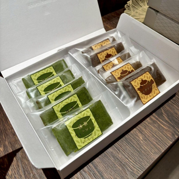 焼菓子用にブレンドした抹茶とほうじ茶を使用し、抹茶には大納言小豆を、ほうじ茶にはくるみをアクセントに、しっとりとした食感に仕上げました。ひと口食べるとふわっと広がる優しい甘さとともに、香ばしいお茶の風味とバターの香りが口いっぱいに広がります。