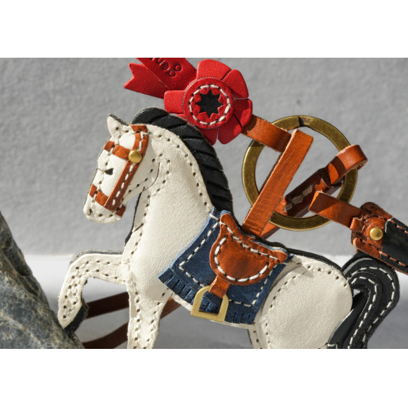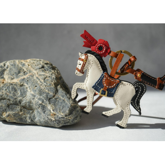 馬は古来より「勝負運」や「金運」を招く象徴とされてきました。特に左向きの馬は「左馬(ひだりうま)」と呼ばれ、福を呼び込む縁起物として知られています。gentenの馬チャームは、この左馬をモチーフにし、丁寧なレザーワークで仕上げました。白い馬体に添えられたブーツと勲章のモチーフは、新しい年を颯爽と駆け抜けるような希望を感じさせます。
