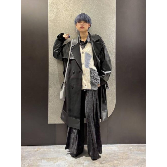 ウーリーテックを使用したロングコートは、軽く暖かい着心地!レザーの切り替えがアクセントになります!