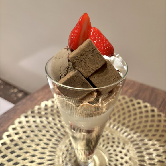 ショコラのまろやかさと、ほうじ茶の香ばしさが調和した、ほうじ茶好きにもショコラ好きにもご満足いただけるパフェに仕上げました。