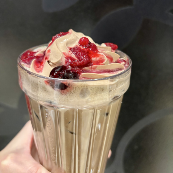 そしてこのドリンクのポイントは、ショコラホイップの上にかかっているミックスベリーソース!
