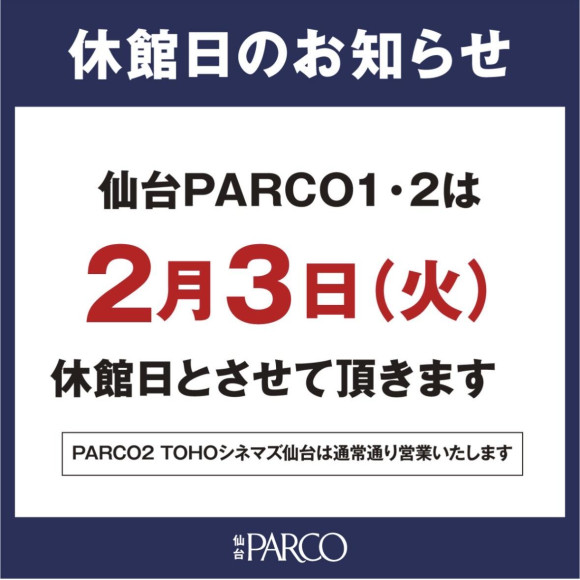 2月3日(火)はパルコの休館日です。ご来店予定だったお客様はご注意ください。