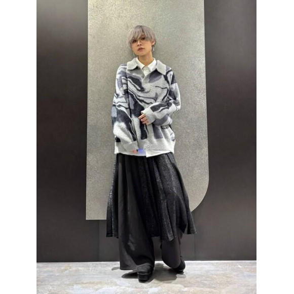 抽象的なマーブル柄をベースにしたグラフィックデザインが特徴。シャギー素材で表現することで、糸同士が重なり合い、ニットでしか出せない動きのある立体的なグラフィックに。