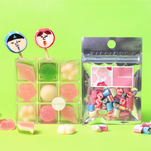今年のキャンディは、例年とはひと味違う、パパブブレらしい遊び心を加えたデザインが特徴です。ちょっぴりシュールで個性的な表情のお内裏様とお雛様を主役にした、印象的なキャンディに仕上げました。ぼんぼりはキャンディ全体で表現し、明るい場所にかざすと、実際のぼんぼりのようにクリア部分が光る仕様となっています。桃の花は、1粒の中に白とピンクの2種をデザインし、全体の華やかさと可愛らしさを引き立てています。全体的にコクのある甘さのフレーバーが多いため、噛んで食感と味の広がりを楽しんでいただくのがおすすめです。