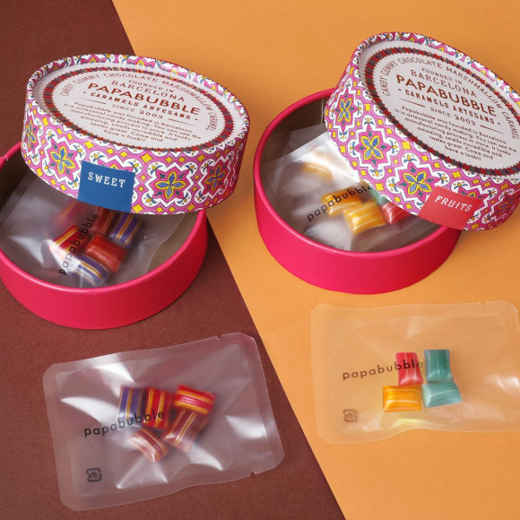 今回のチョコレート入りキャンディは、フルーツフレーバーをチョコレートと贅沢に組み合わせた「フルーツ」と、スイーツ系の味わいを中心に仕上げた「スイーツ」の2種類をご用意しました。