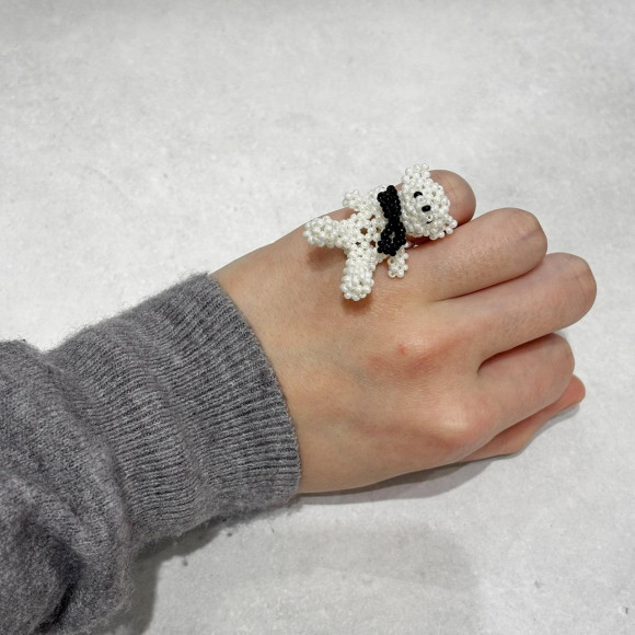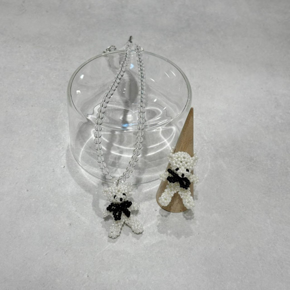 透明ビーズのネックレスに、リボンを付けたクマモチーフが揺れる愛らしいデザイン。