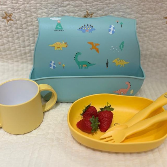 さっと水洗いでき、お手入れ簡単なシリコーン製ビブ。立体ポケットが食べこぼしをしっかりキャッチしてくれます。