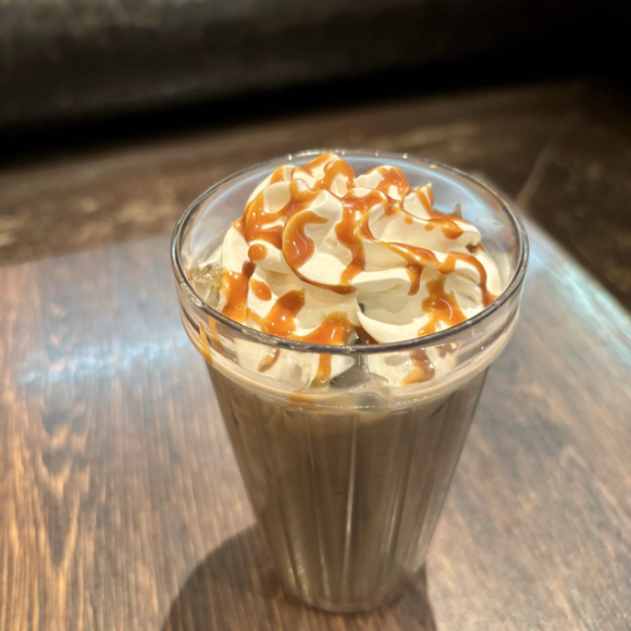ふわふわのホイップクリームとキャラメルソースをトッピングしました。
