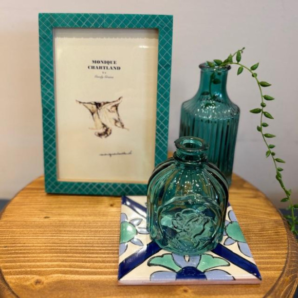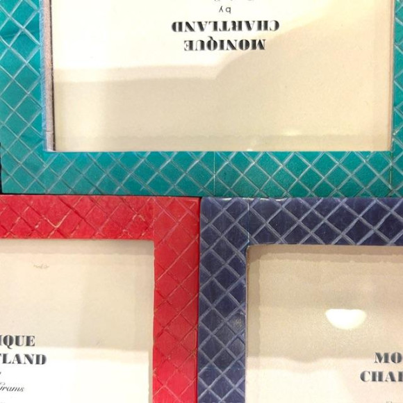 斜めに交差する彫り模様と鮮やかな発色が目を惹く、シンプルながら存在感のあるフォトフレームです。