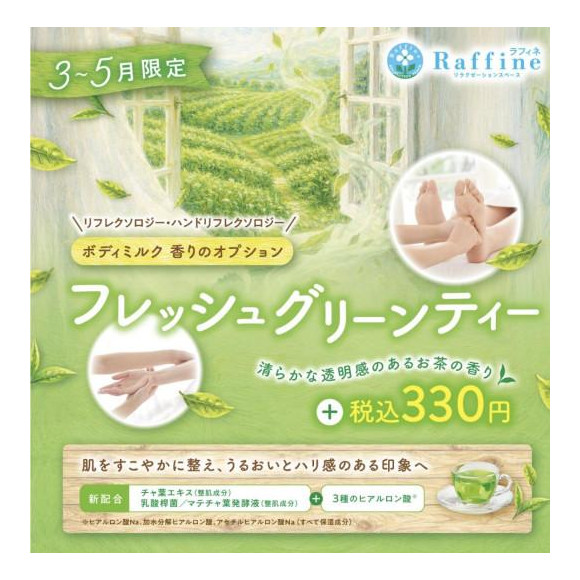 3月1日(日)~5月31日(日)まで限定、リフレクソロジー・ハンドリフレクソロジーに使用しているボディミルクに今年は『フレッシュグリーンティーの香り』が登場!