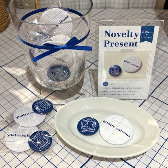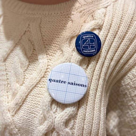缶バッチは方眼デザインにロゴをあしらった大きめサイズ、ブルーにキャトルセゾンのアイコンが描かれた小さめサイズの2個セット。