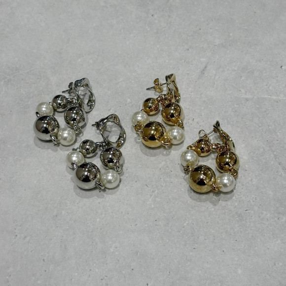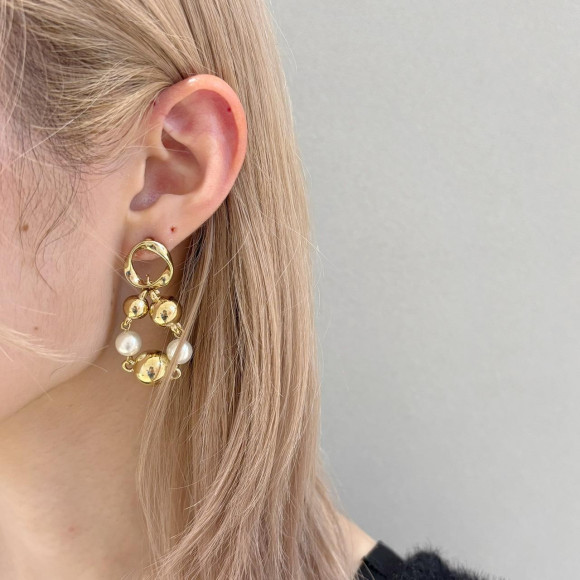 メタルボールとパールが揺れる、存在感のあるピアス。