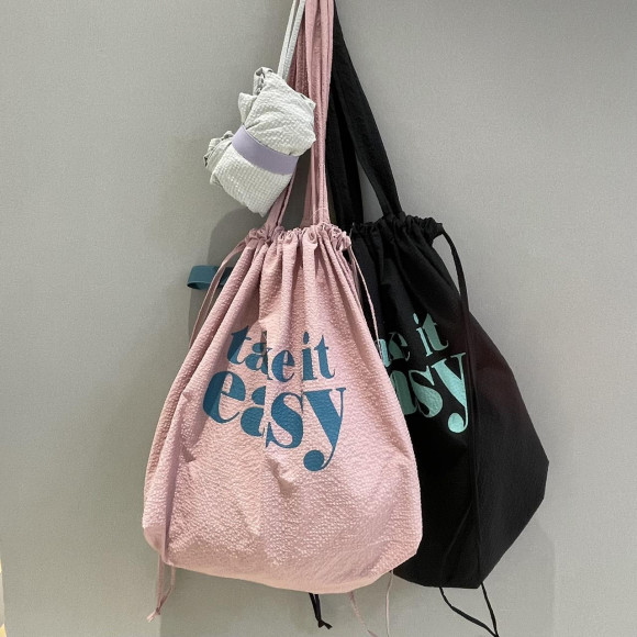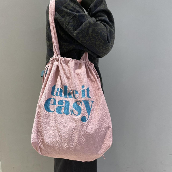 大き目サイズのざっくりコロンとした形がかわいい巾着トートバッグ。