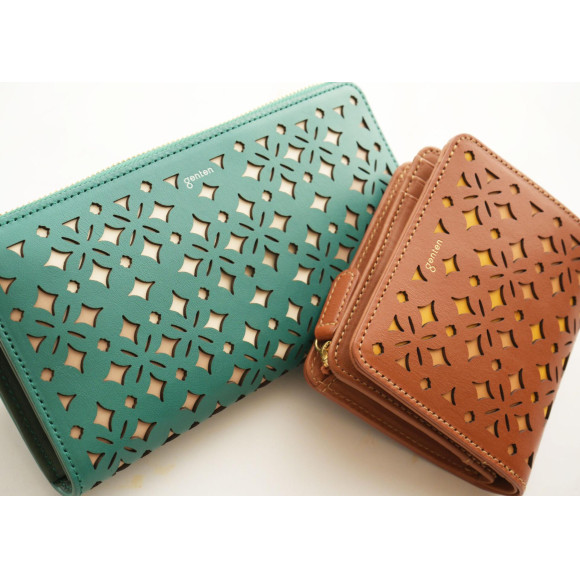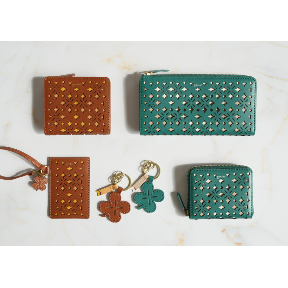 クローバーの抜き柄の下には、カーフレザーを4分割で当て、2色のバイカラーに。基本カラーはグリーンとブラウンの2色。型ごとに、配色の表情も楽しめます。