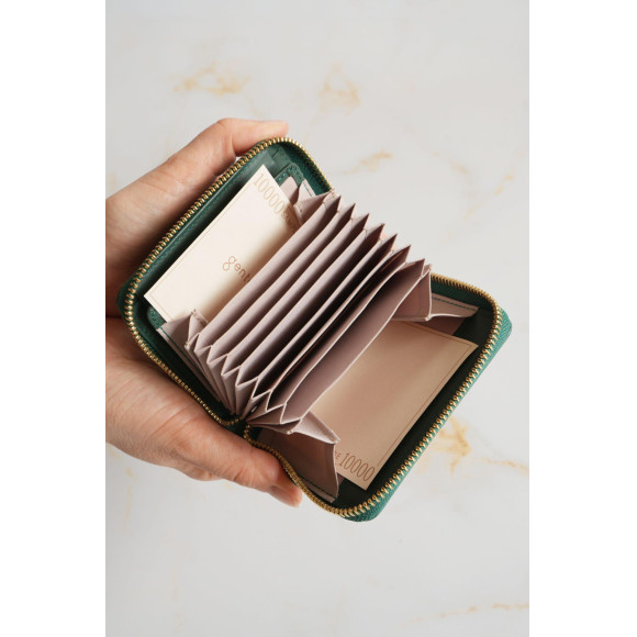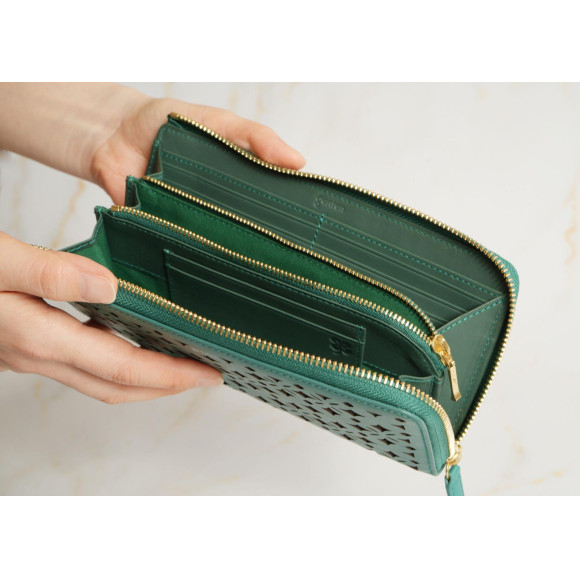 長財布はLファスナーで開閉がスムーズに、カードは14枚収納できます。中のファスナーポケットはラウンド型のゆるやかなカーブで、開けるたび心をそっと穏やかにしてくれます。