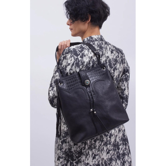 オーバーレイ、フリンジ、コンチョといった装飾を大胆に使ったトートバッグ。