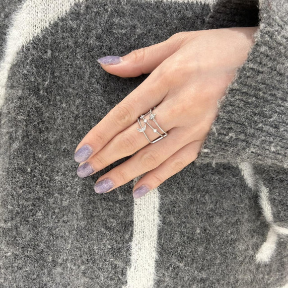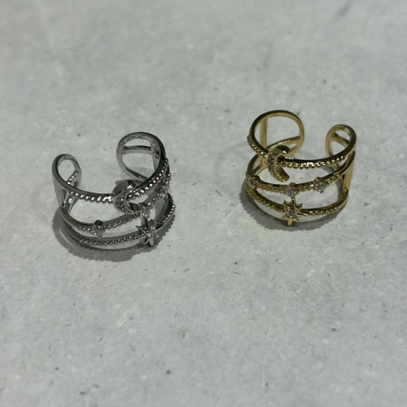 さっとつけるだけで星や月のモチーフリングを重ね付けしているかのように見えるリング。