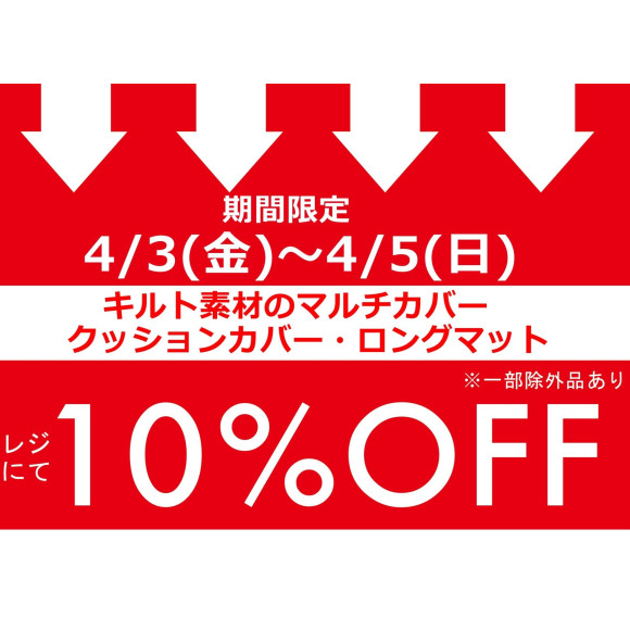 内容:キルト素材のマルチカバー、クッションカバー、ロングマットお買い上げでレジにて10%OFFいたします