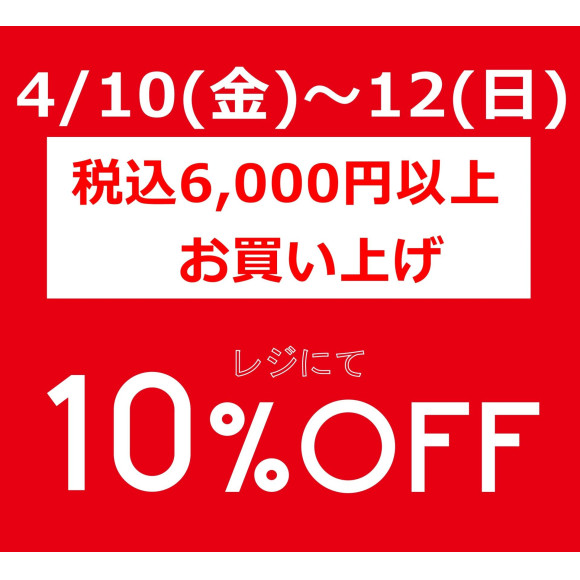 内容:期間中、税込み価格¥6000以上ご購入でレジにて10%OFFいたします