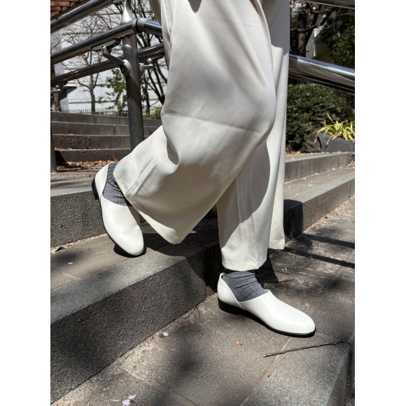 独特な靴のシルエットが足元をきれいに見せてくれるので、素足はもちろん、靴下とのコーディネートでアクセントを加えるなど、幅広いスタイリングに合わせていただけます。