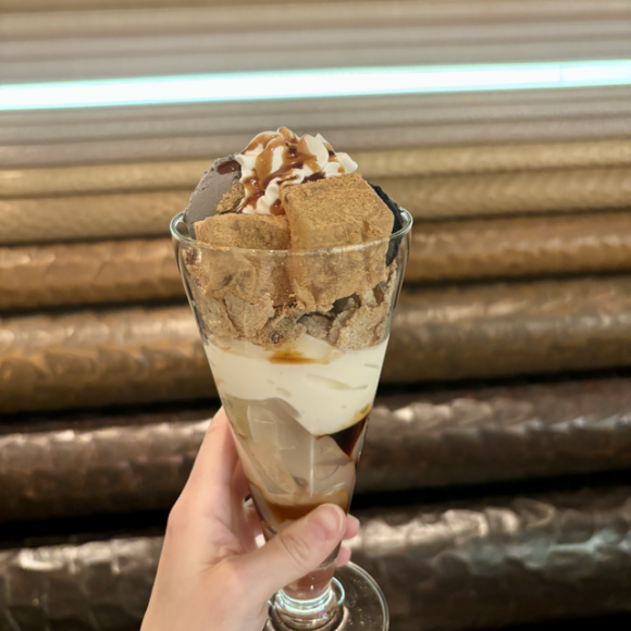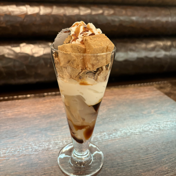 濃厚な黒胡麻アイスと黒胡麻あん、もちもち食感のわらび餅がトッピングされたこちらのパフェ。