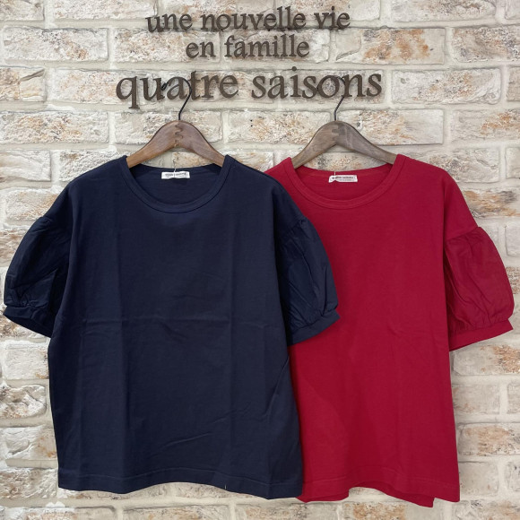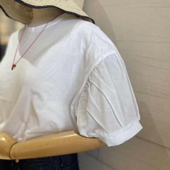 袖口を布帛で切り替えた、上品な印象のパフスリーブのTシャツです。