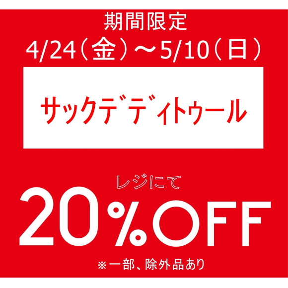 内容:サックデディトゥールお買い上げでレジにて20%OFFいたします