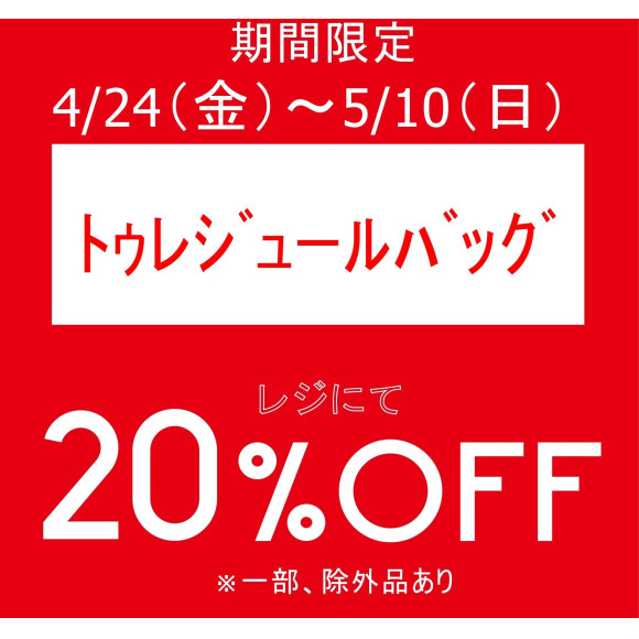 内容:トゥレジュールバッグお買い上げでレジにて20%OFFいたします