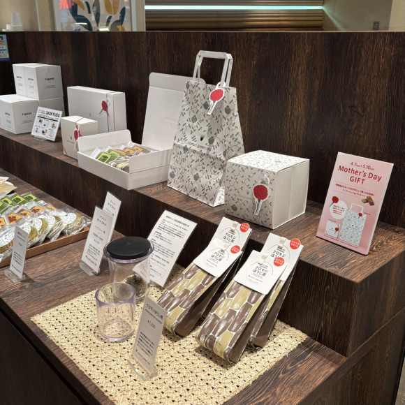 5月10日までの期間、物販商品を税込1,500円以上ご購入いただくと、お好きなフィナンシェを1個プレゼントいたします。また、ご希望により、パッケージにオリジナルの母の日ギフトタグをお付けいたします。タグをご希望のお客様はお気軽にスタッフにお申し付けください。