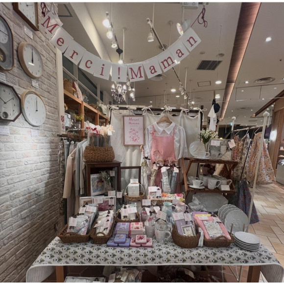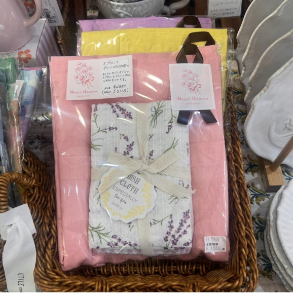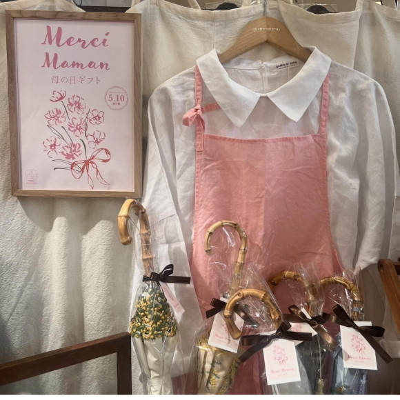 きれいなパステルカラーのエプロン、これからの季節に大活躍する日傘、上品なすずらんモチーフのテーブルウェアなど。