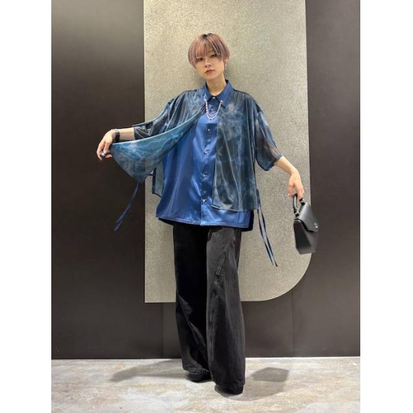 レイヤードになっているデザインがインパクトのあるシャツ!シアー部分と内側の生地が分離しており、内側の部分だけインしたりベルトを巻いたり、そのまま羽織ったり…と遊びの効いたアイテムです!