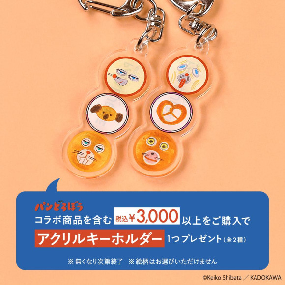 全国の店舗で「パンどろぼう」商品1点以上を含む、税込3,000円毎のご購入で、「オリジナルアクリルキーホルダー」をおひとつプレゼント!